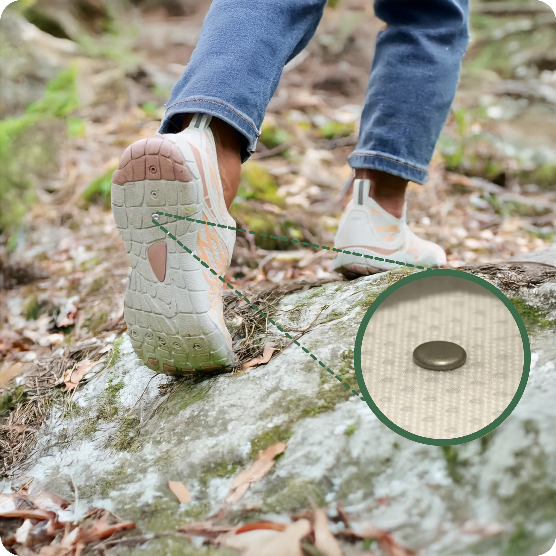 Dankzij de innovatieve geleidende zool met koperen element blijf je in contact met de aarde tijdens wandelen op gras, zand of aarde. -